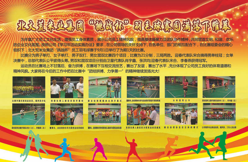 為豐富廣大員工文化生活,增強(qiáng)員工身體素質(zhì),展示公司員工精神風(fēng)貌,提高整體凝聚力及團(tuán)隊(duì)協(xié)作精神,共同營造文明、和諧、歡樂的企業(yè)文化氛圍。經(jīng)研究決定舉辦“挑戰(zhàn)杯”員工羽毛球比賽。在接到公司《黑龍江省北大荒米業(yè)集團(tuán)有限公司工會委員會關(guān)于舉辦“挑戰(zhàn)杯”員工羽毛球比賽的通知》的時(shí)候,熱愛羽毛球運(yùn)動的我可以用歡呼雀躍來形容自己的心情。