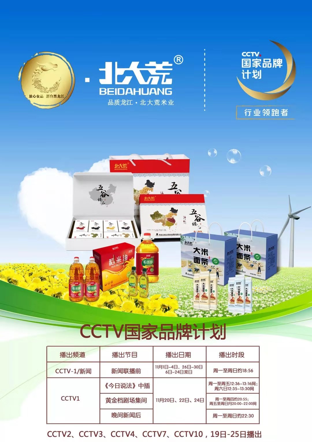 在中國經(jīng)濟步入新常態(tài)、供給結(jié)構(gòu)性改革進入關(guān)鍵期的大背景下,北大荒集團緊跟時代脈博,成功攜手CCTV國家品牌計劃,將于11月1日于CCTV一1/新聞聯(lián)播前、《今日說法》中插、黃金檔劇場集間、晚間新聞后、及CCTV2、CCTV3、CCTV4、CCTV7、CCTV10等頻道開播,排期至11月30日。