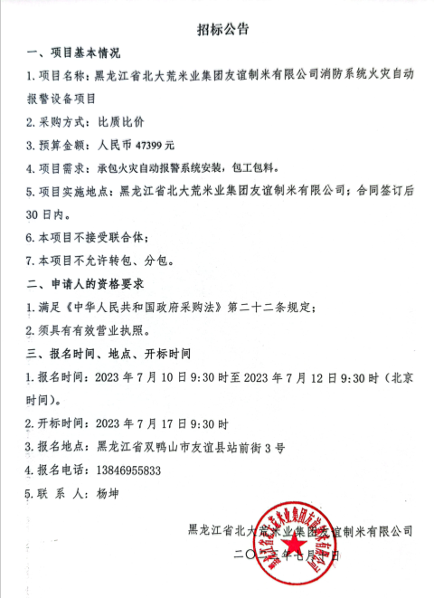 黑龍江省北大荒米業集團友誼制米有限公司消防系統火災自動報警設備招標公告