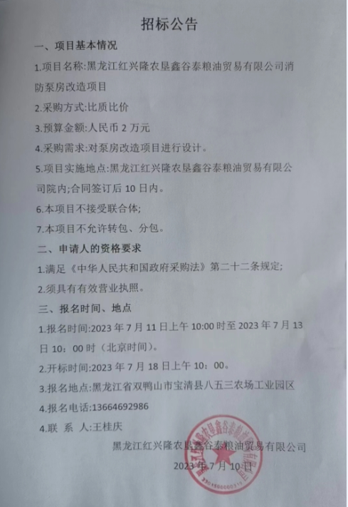 黑龍江紅興隆農(nóng)墾鑫谷泰糧油貿(mào)易有限公司消防泵房改造項(xiàng)目招標(biāo)公告