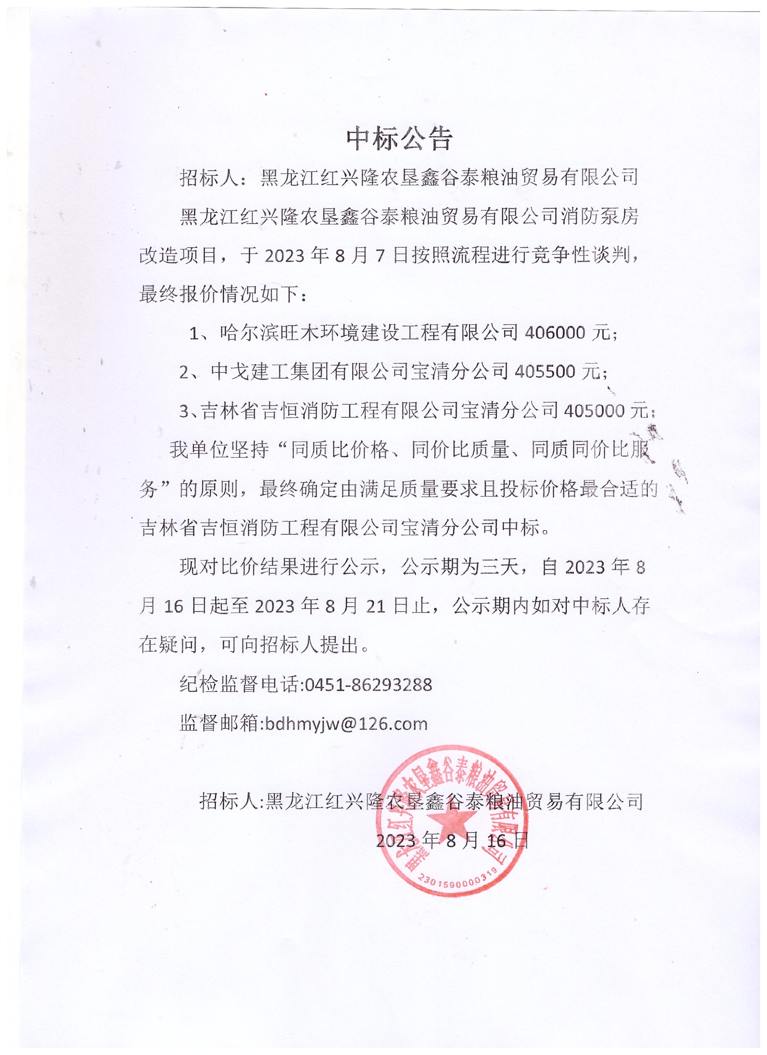 黑龍江紅興隆農(nóng)墾鑫谷泰糧油貿(mào)易有限公司消防泵房改造項(xiàng)目中標(biāo)公告