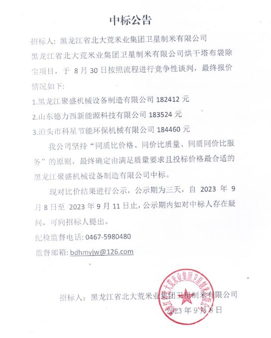 黑龍江省北大荒米業集團衛星制米有限公司烘干塔布袋除塵項目中標公告
