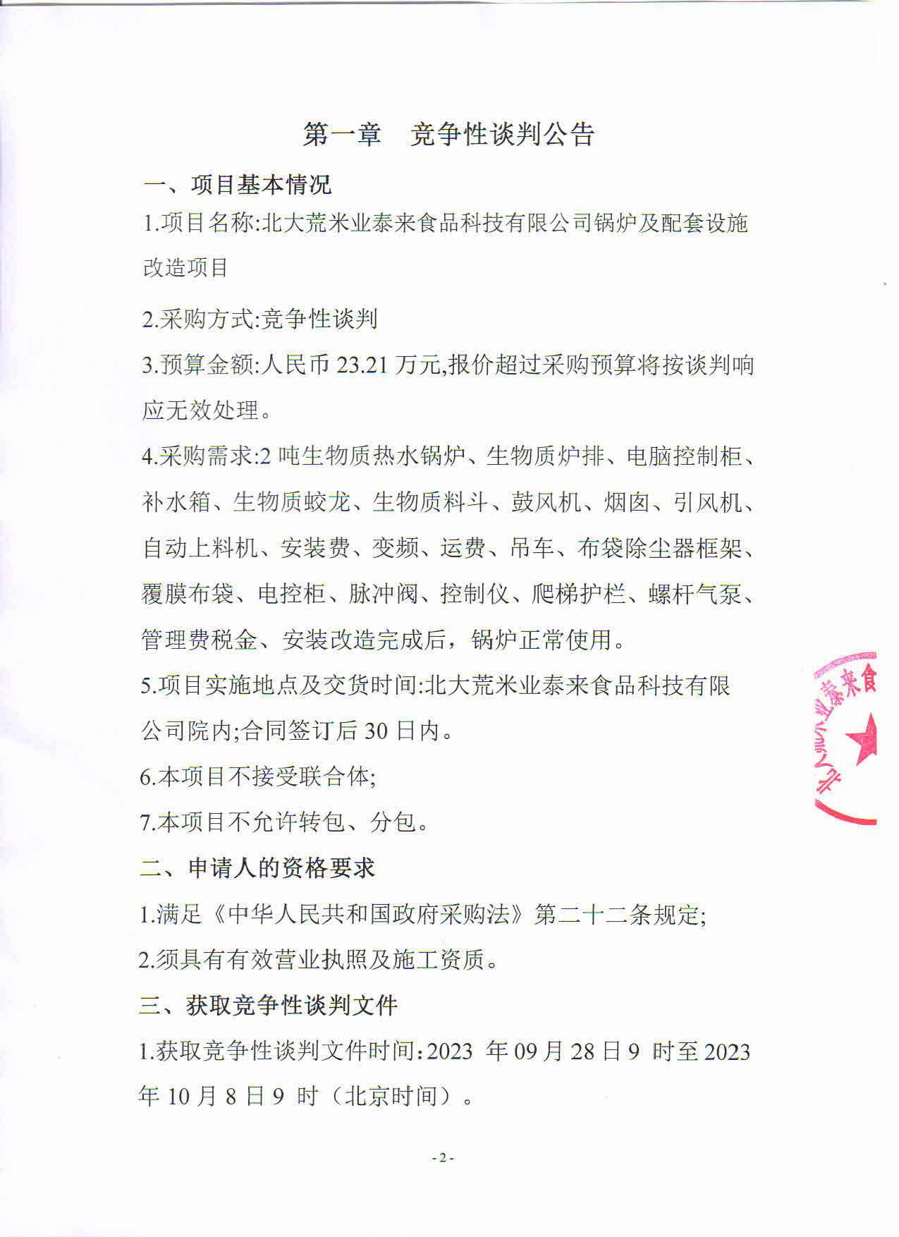 北大荒米業泰來食品科技有限公司鍋爐及配套設施改造項目競爭性談判公告