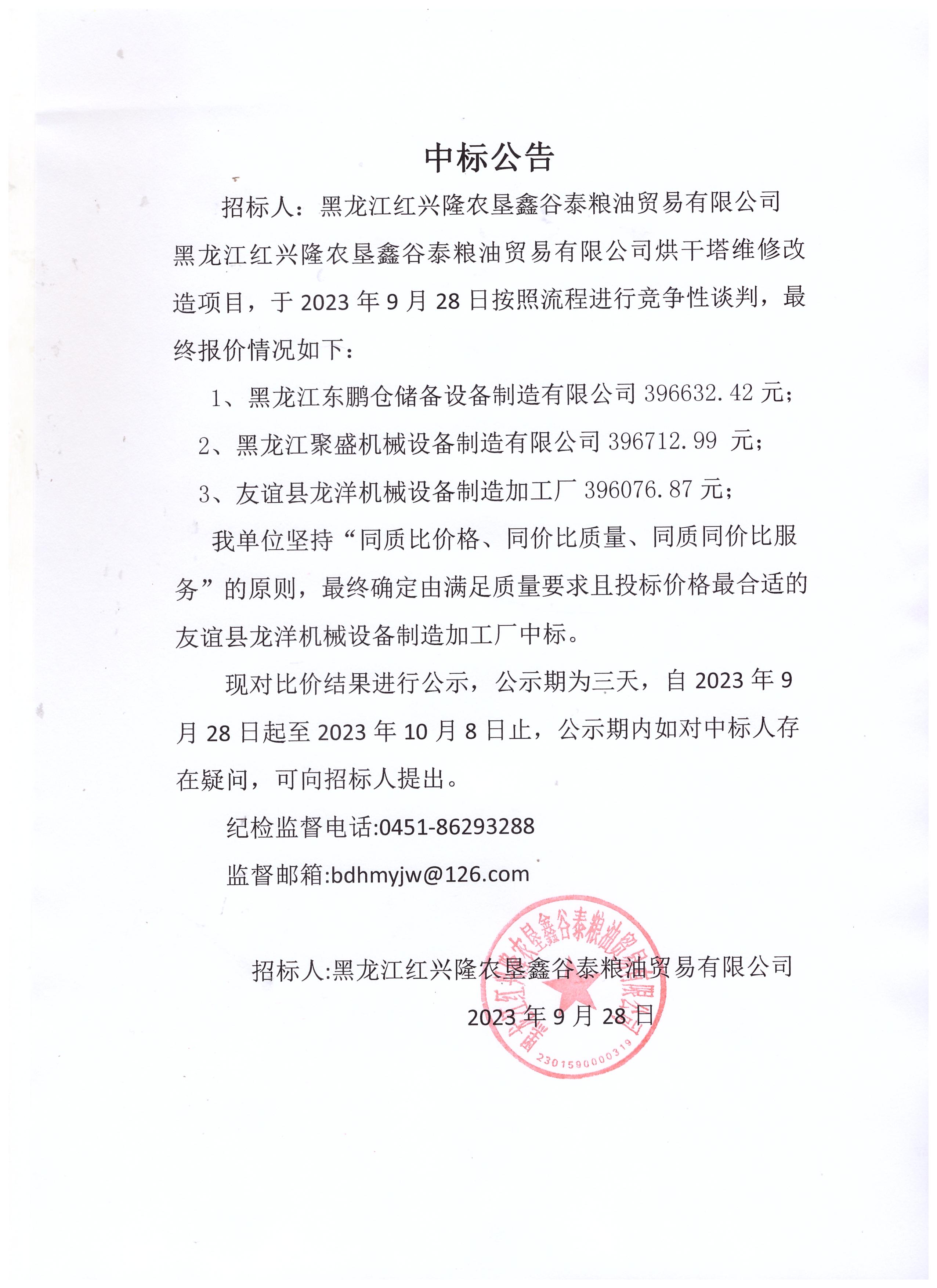 黑龍江紅興隆農墾鑫谷泰糧油貿易有限公司烘干塔維修改造項目中標公告