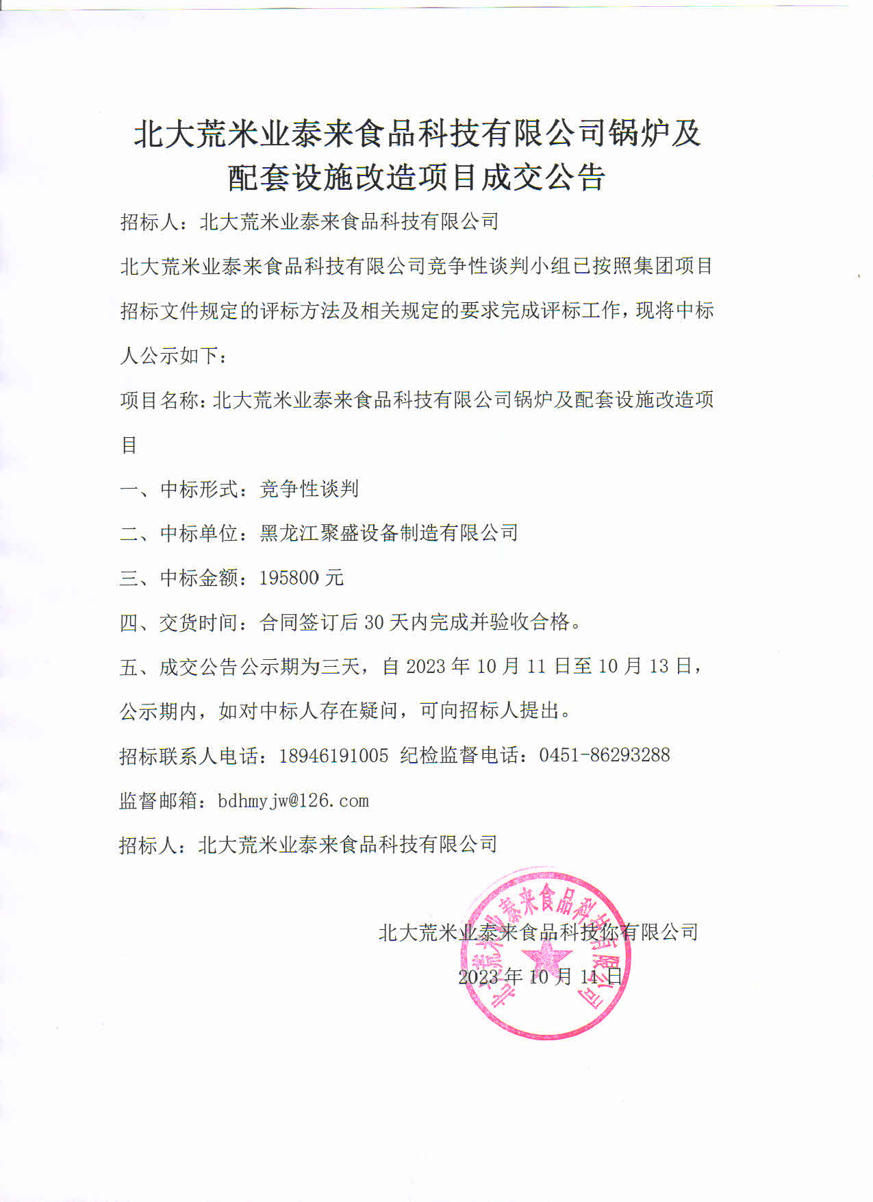 北大荒米業泰來食品科技有限公司鍋爐及配套設施改造項目成交公告