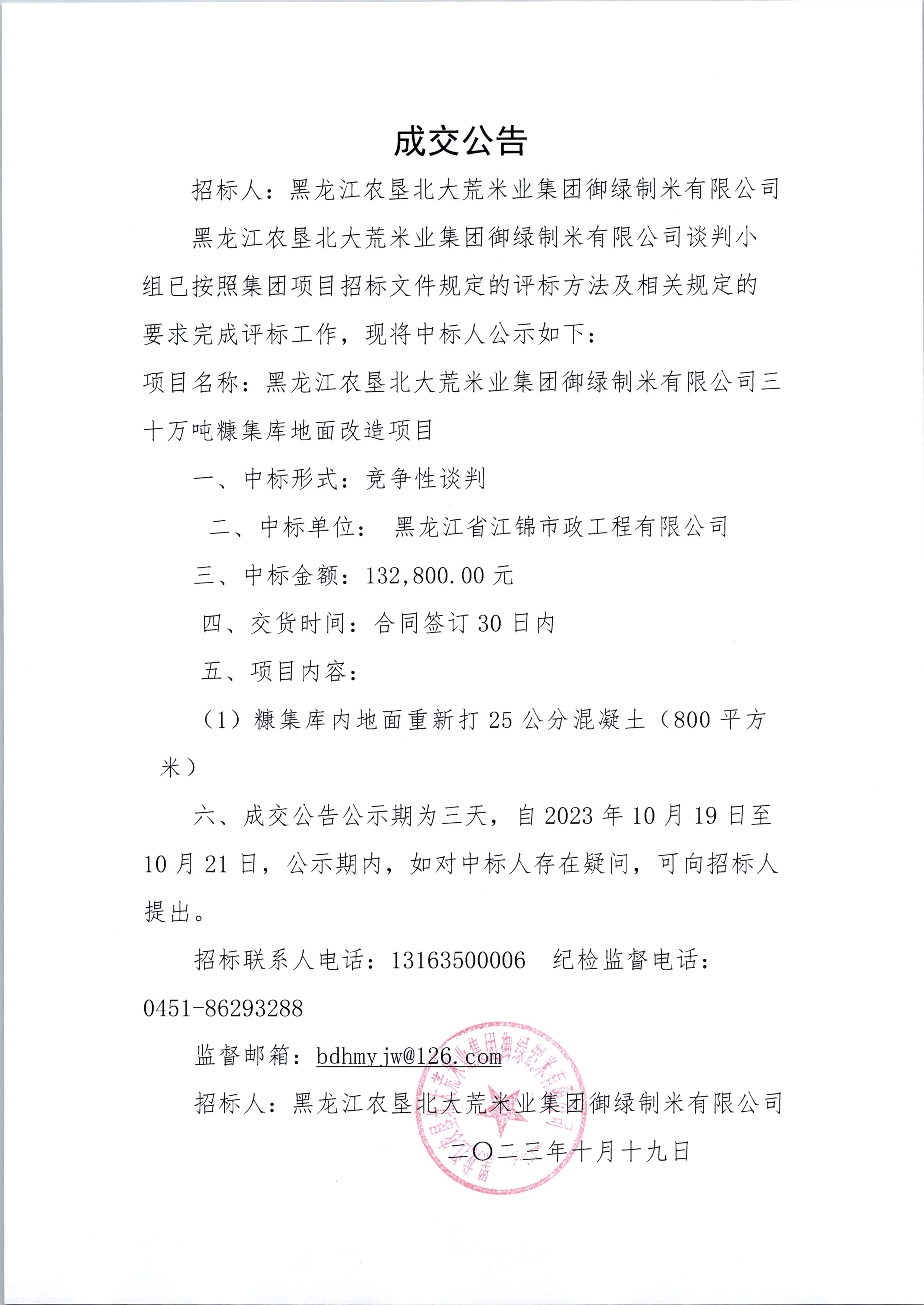 黑龍江農(nóng)墾北大荒集團(tuán)御綠制米有限公司三十萬噸糠集庫地面改造項目成交公告