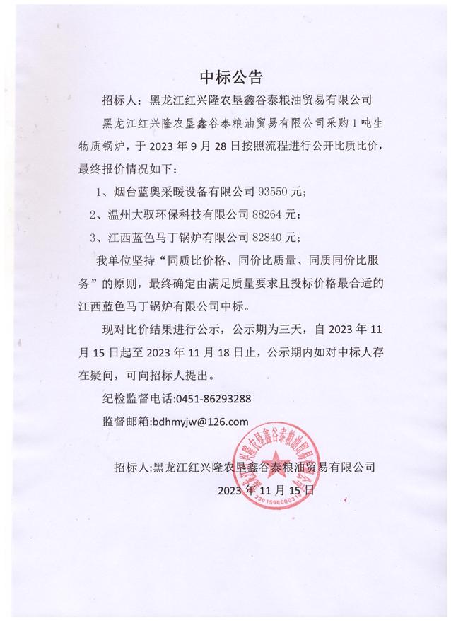 黑龍江紅興隆農墾鑫谷泰糧油貿易有限公司中標公示