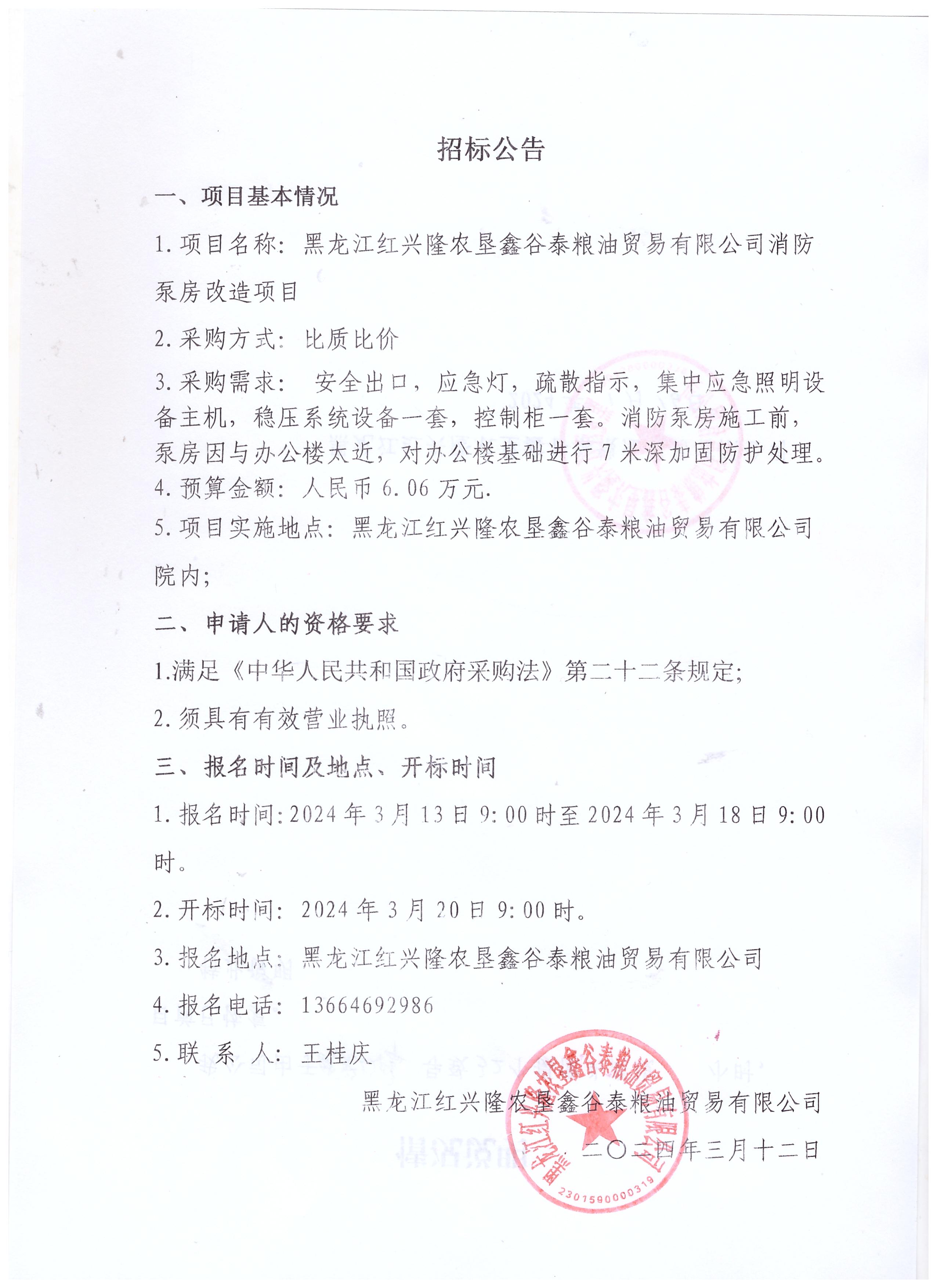 黑龍江紅興隆農(nóng)墾鑫谷泰糧油貿(mào)易有限公司消防泵房改造項目招標(biāo)公告