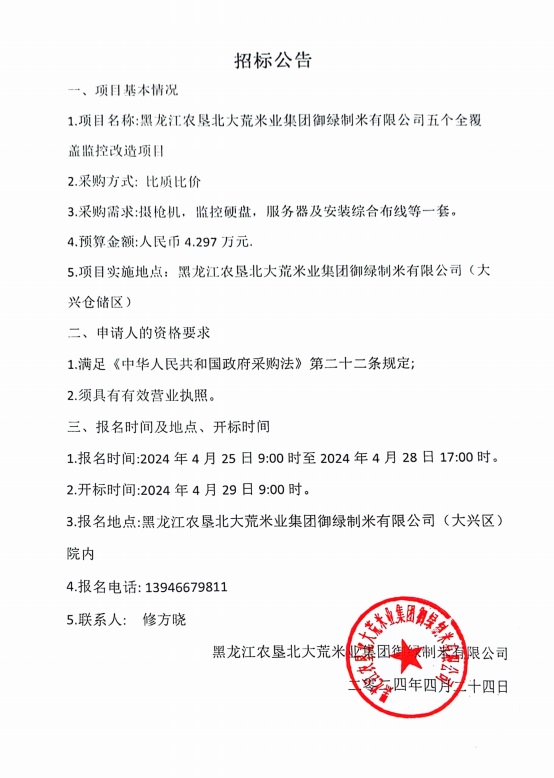 北大荒米業(yè)御綠公司五個(gè)全覆蓋監(jiān)控改造項(xiàng)目招標(biāo)公告