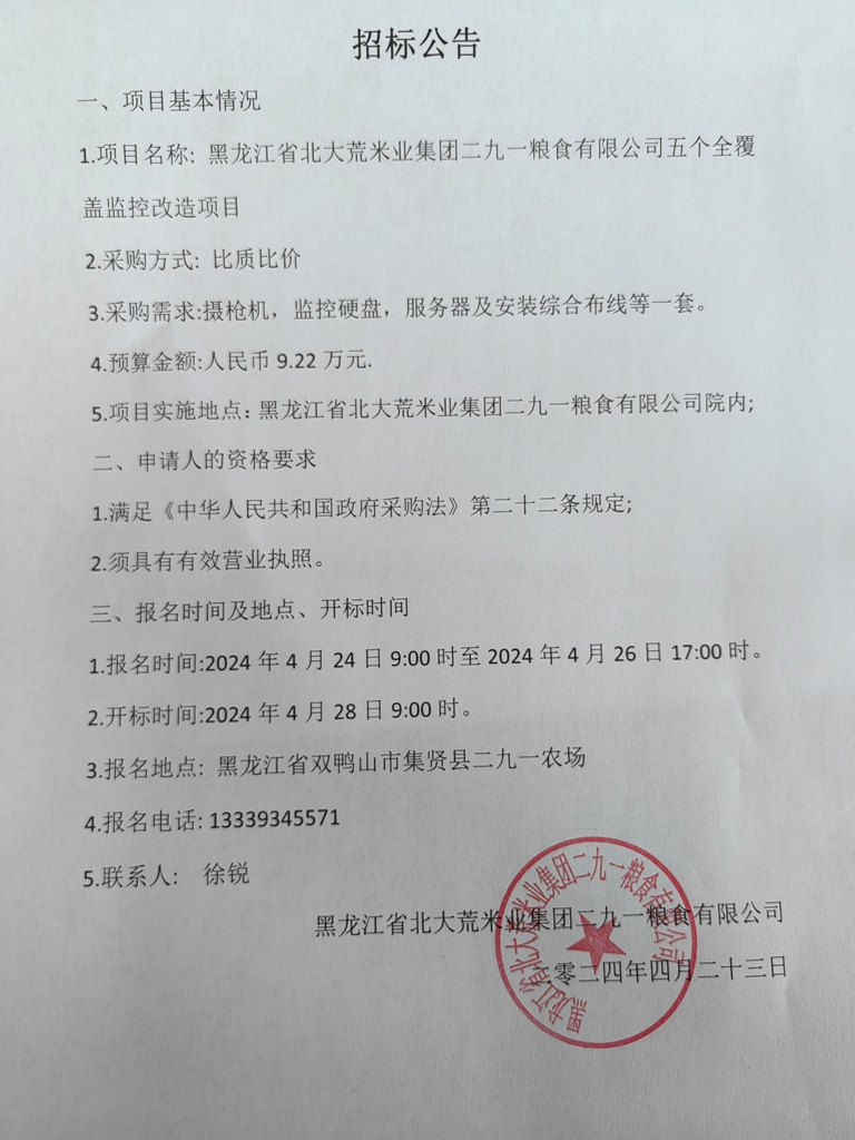 北大荒米業(yè)二九一公司五個(gè)全覆蓋監(jiān)控改造項(xiàng)目招標(biāo)公告
