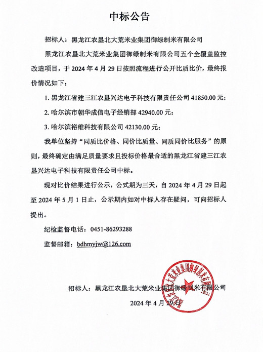 北大荒米業(yè)御綠公司五個全覆蓋監(jiān)控改造項目中標公告