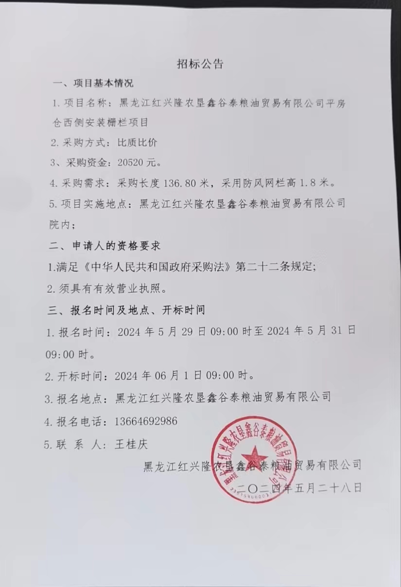 黑龍江紅興隆農墾鑫谷泰糧油貿易有限公司平房倉西側安裝欄柵項目招標公告