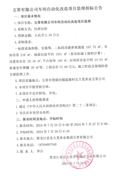 五常有限公司車間自動化改造項目監理招標公告