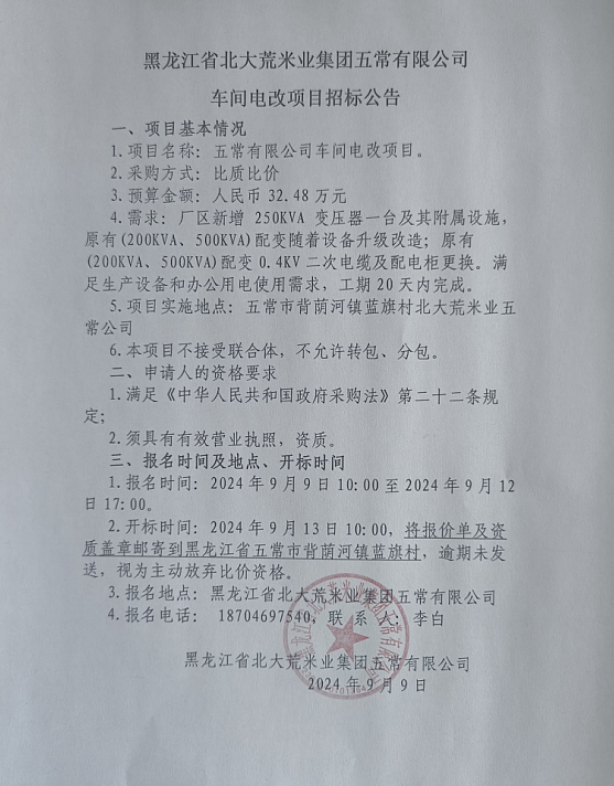 黑龍江省北大荒米業集團五常有限公司 車間電改項目招標公告