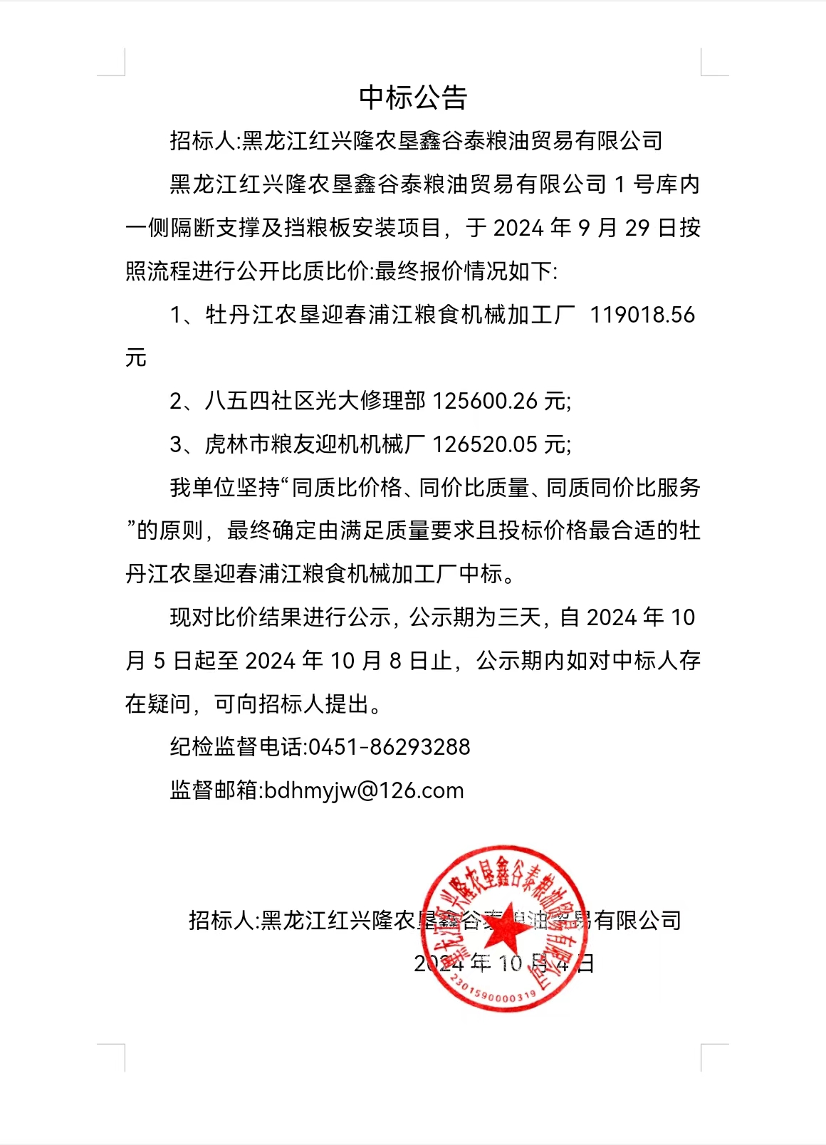鑫谷泰糧油公司1號庫隔斷支撐及擋糧板項目中標公告