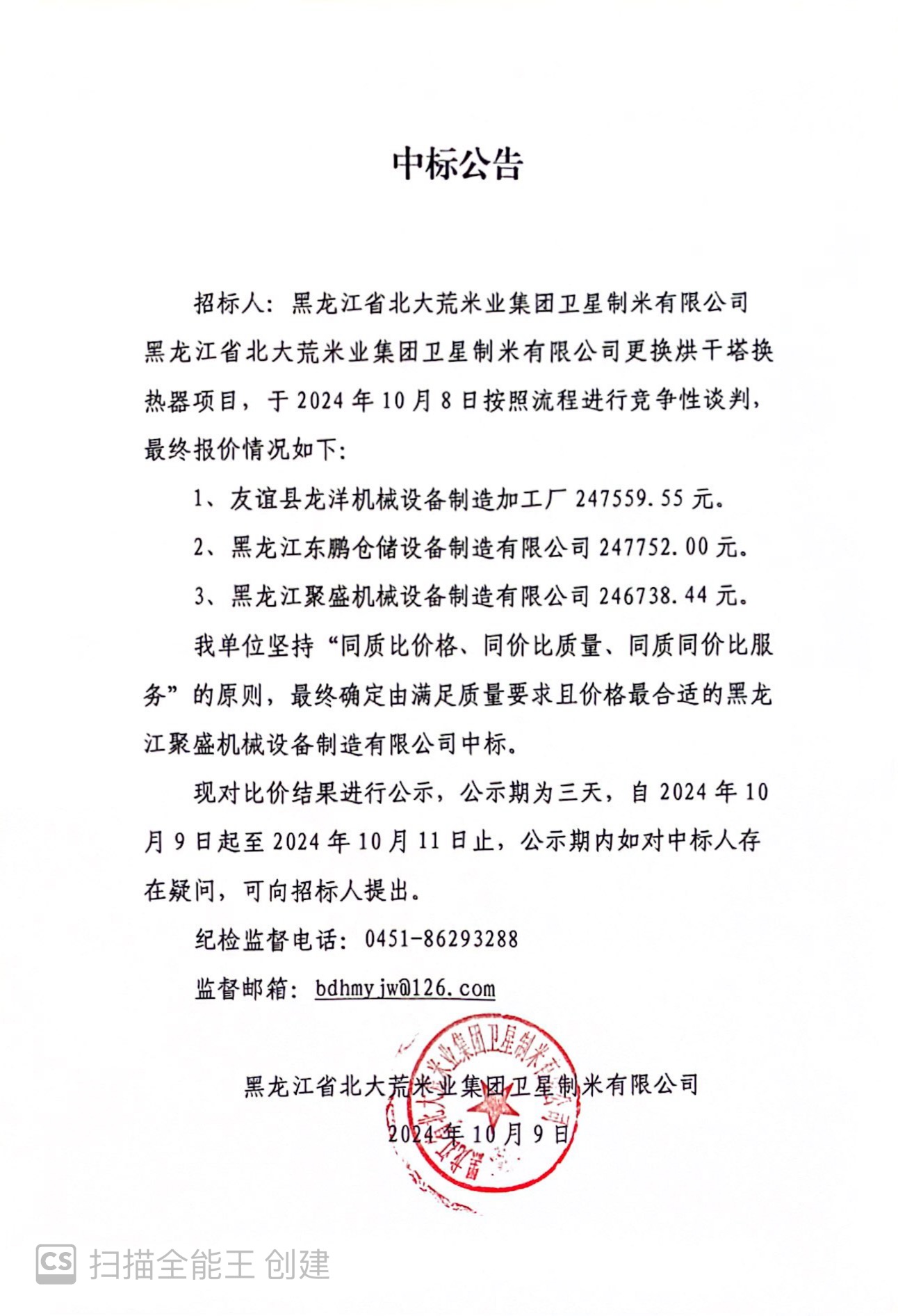 黑龍江省北大荒米業集團衛星制米有限公司更換烘干塔換熱器項目中標公告