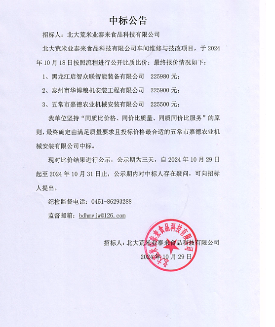 泰來科技有限公司車間維修與技改項目中標公告