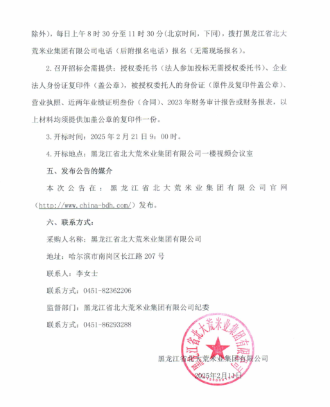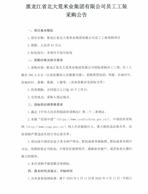 黑龍江省北大荒米業集團有限公司員工工裝采購項目招標公告