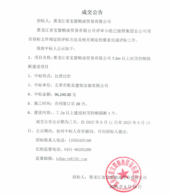 黑龍江省寶盟糧油貿(mào)易有限公司7.2m以上封頂擋糧隔斷建設(shè)項(xiàng)目成交公告