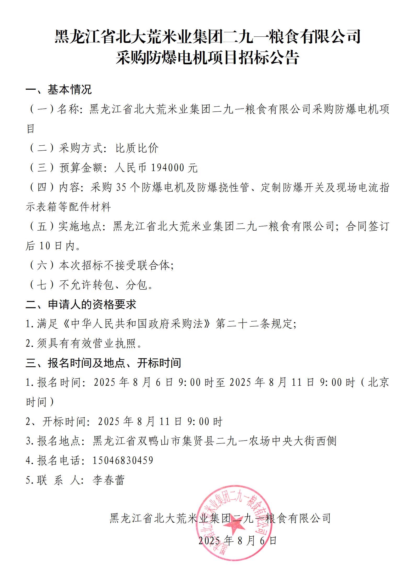 黑龍江省北大荒米業集團二九一糧食有限公司采購防爆電機項目招標公告