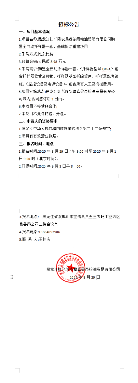 黑龍江紅興隆農(nóng)墾鑫谷泰糧油貿(mào)易有限公司購置全自動(dòng)扦樣器一套、基礎(chǔ)拆除重建項(xiàng)目