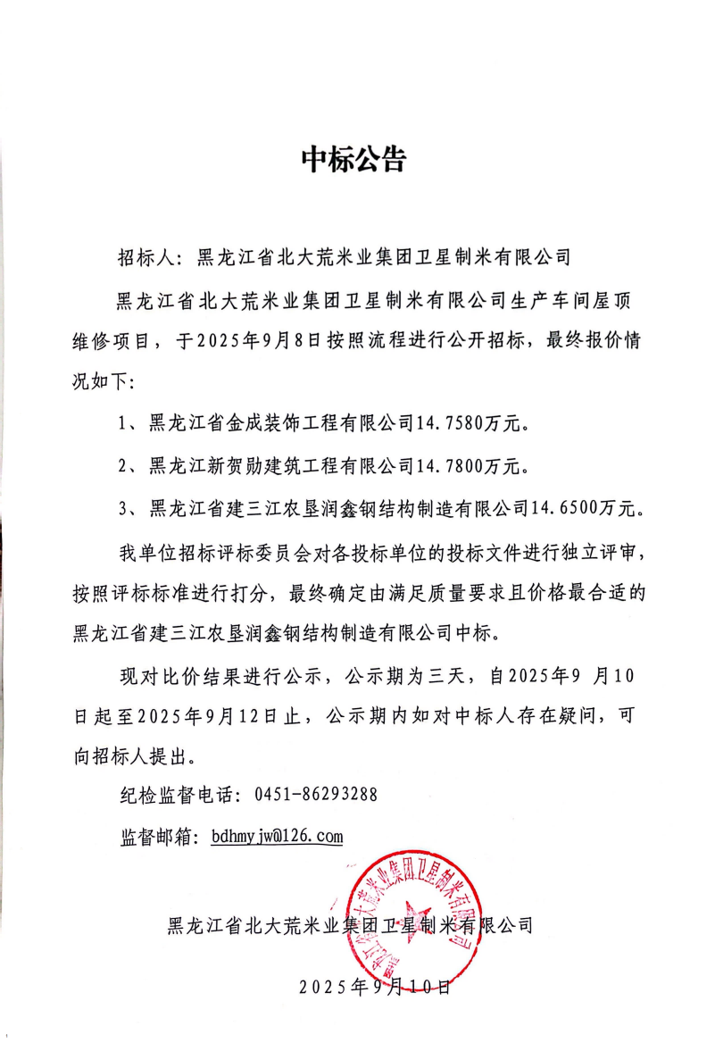衛星制米有限公司生產車間屋頂維修項目中標公告