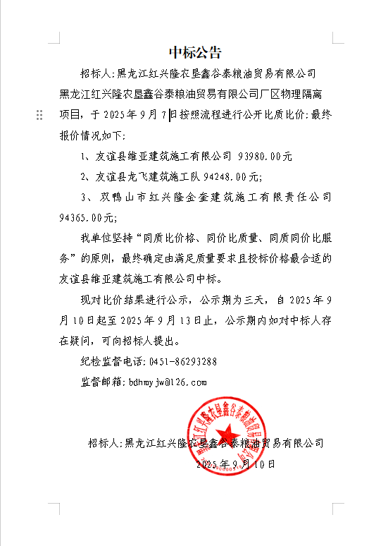 鑫谷泰糧油貿易有限公司廠區物理隔離項目中標公告