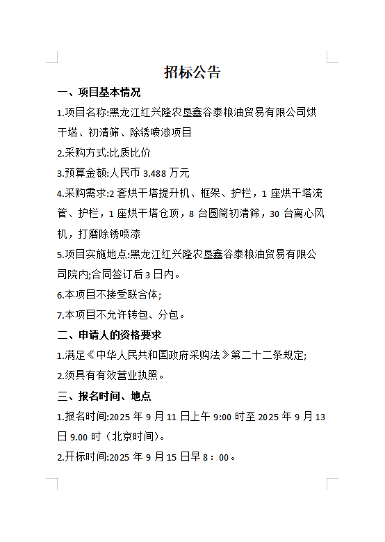 鑫谷泰糧油貿(mào)易有限公司烘干塔、初清篩、除銹噴漆項目招標(biāo)公告