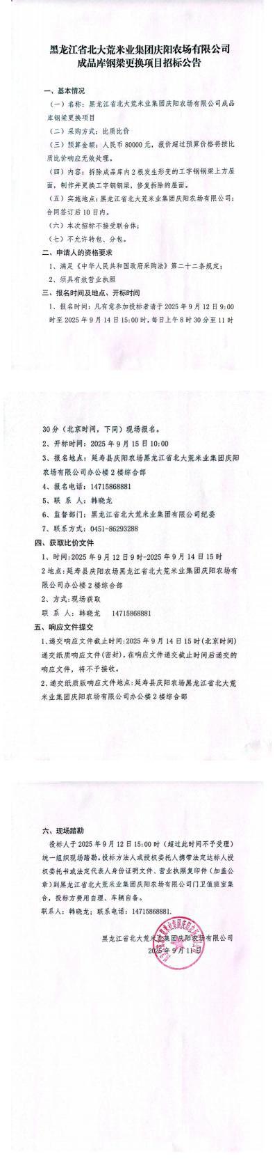 黑龍江省北大荒米業集團慶陽農場有限公司成品庫鋼梁更換項目招標公告