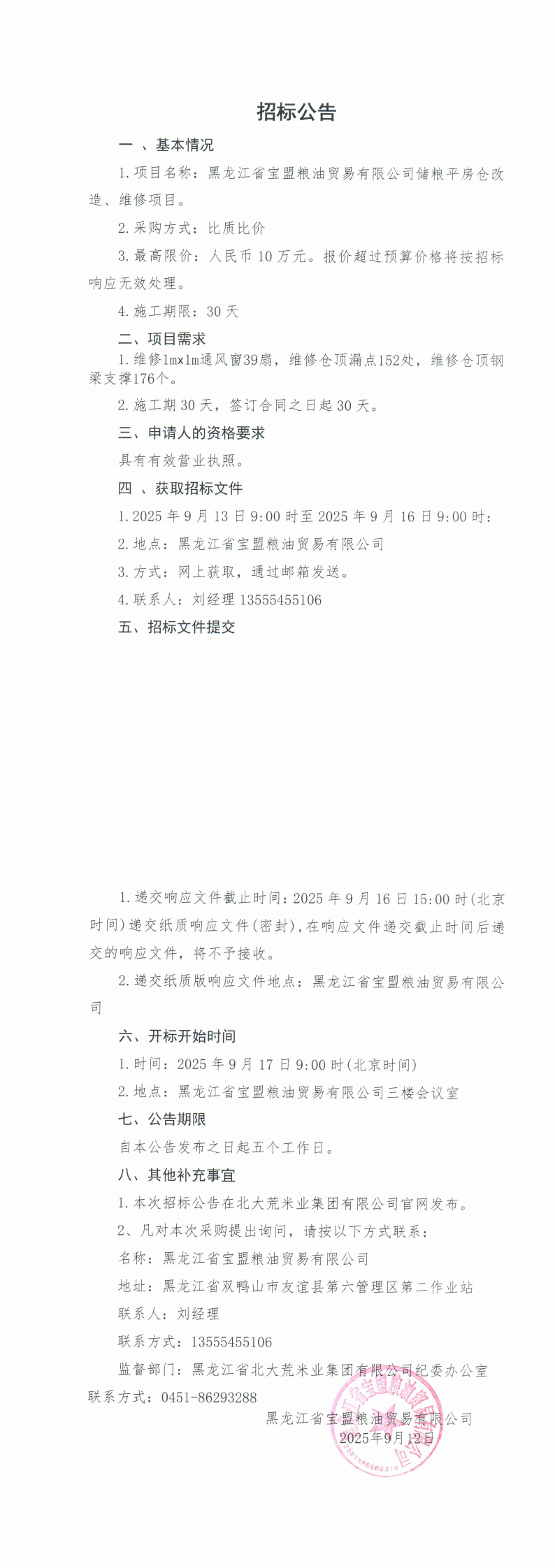 寶盟糧油貿易有限公司儲糧平房倉改造、維修項目招標公告