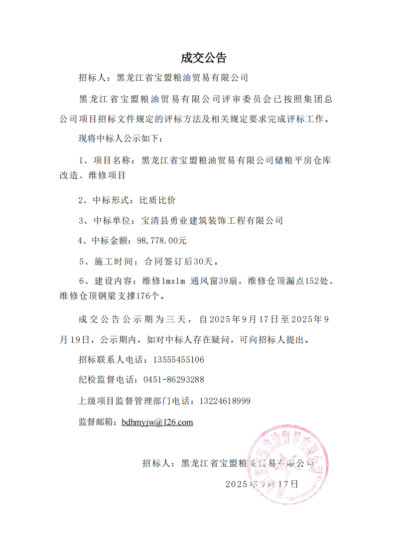 黑龍江省寶盟糧油貿易有限公司儲糧平房倉庫改造、維修項目中標公告