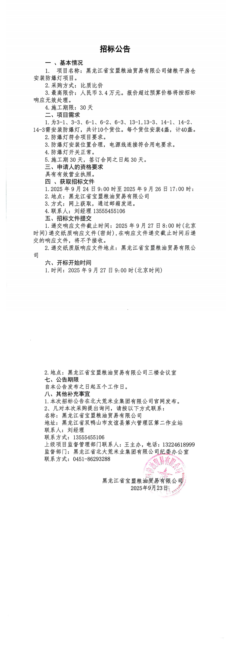 黑龍江省寶盟糧油貿易有限公司儲糧平房倉安裝防爆燈項目招標公告