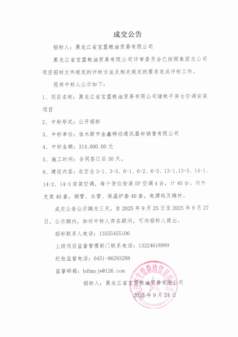 黑龍江省寶盟糧油貿易有限公司儲糧平房倉空調安裝項目中標公告