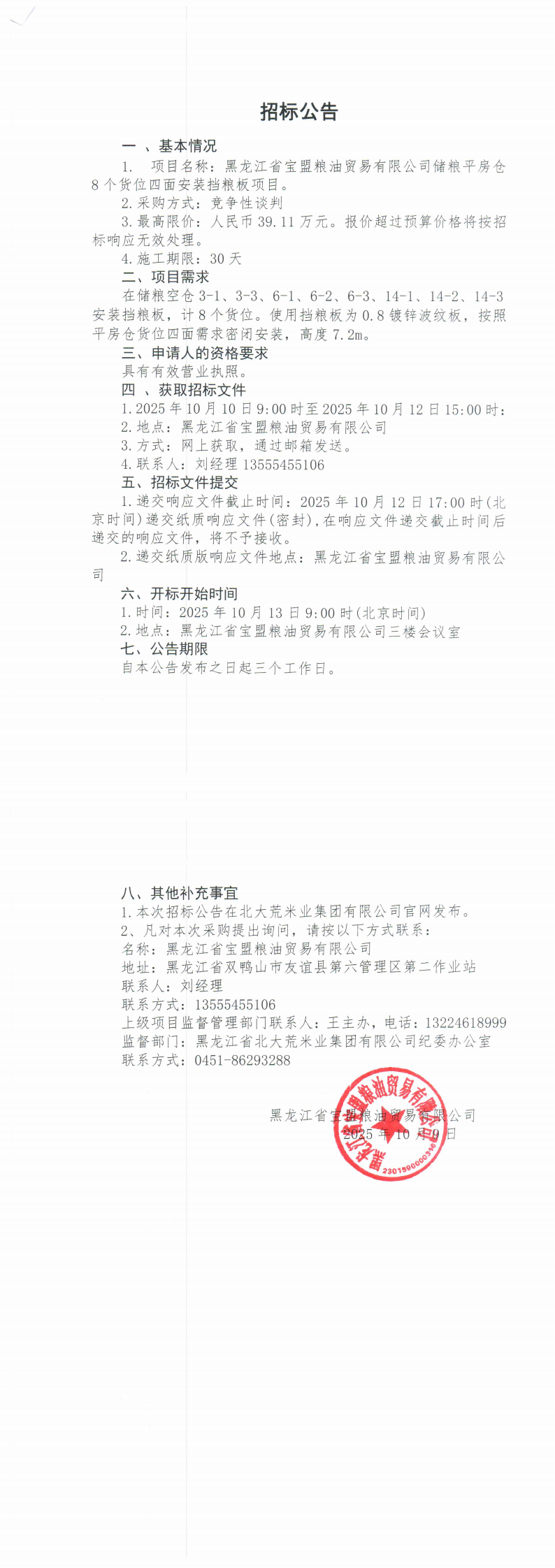 黑龍江省寶盟糧油貿(mào)易有限公司儲糧平房倉 8個(gè)貨位四面安裝擋糧板項(xiàng)目采購公告