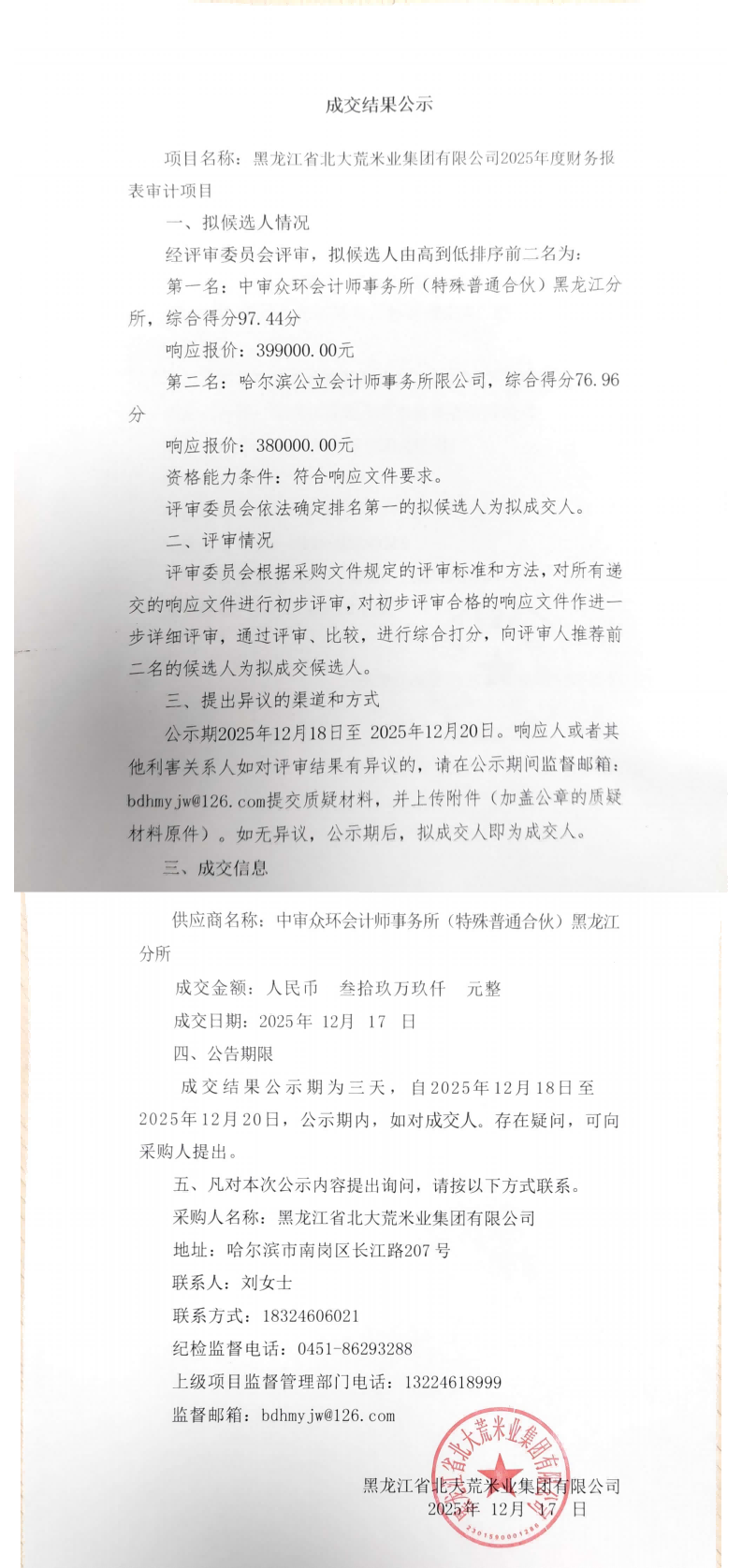 北大荒米業集團有限公司2025年度財務報表審計項目成交公告